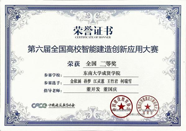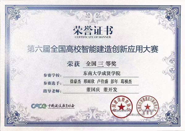 第六届全国高校智能建造创新应用大赛围绕“智能建造赋能行业升级,创新应用培育新型人才”主题。经过激烈角逐,金依涵、孙梦、江灵蕙、王竹君、何瑞雪团队在董开发老师、董国庆老师指导下,荣获全国二等奖;徐豪杰、邢雨欣、卢佺盛、彭年、葛桢杰团队在董国庆老师、董开发老师指导下,荣获全国三等奖。