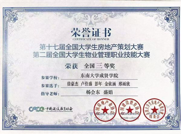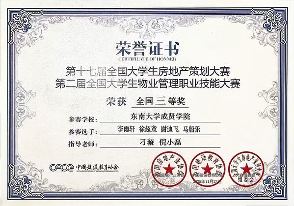 第十七届全国大学生房地产策划大赛暨第二届全国大学生物业管理职业技能大赛以数字化、网络化、智能化赋能房地产行业发展为核心,搭建校企人才培养桥梁,设置房地产开发项目策划、城市更新项目策划等多个参赛方向,吸引了东南大学、哈尔滨工业大学、四川大学等全国众多高校同台竞技。经初赛选拔与总决赛现场展示答辩,我校两支队伍表现突出:徐豪杰、邢雨欣、卢佺盛、彭年、金依涵团队在杨会东老师、盛娟老师指导下荣获全国三等奖;李雨轩、徐超意、尉迪飞、马船乐团队在刁璇老师、倪小磊老师指导下,同样斩获全国三等奖。