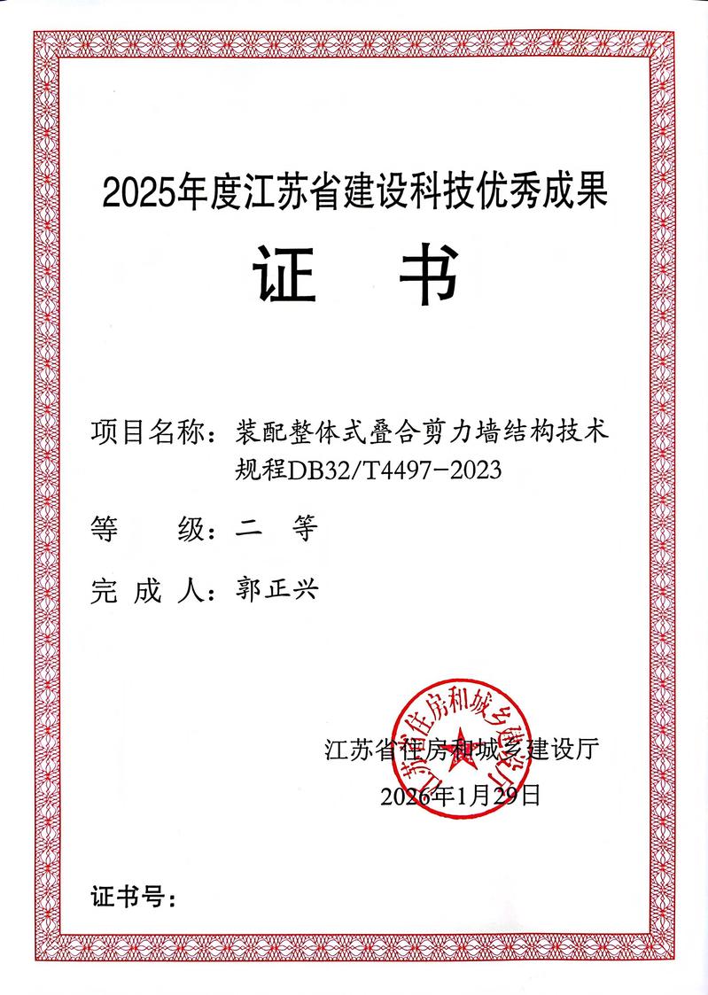 近日,由我院院长郭正兴教授参与主编的《装配整体式叠合剪力墙结构技术规程DB32/T4497-2023》地方标准,荣获2025年度江苏省建设科技优秀成果二等奖。该奖项由江苏省住房和城乡建设厅评定,是全省建设科技领域的重要荣誉,彰显了我院在建筑工业化领域的科研实力与行业影响力。